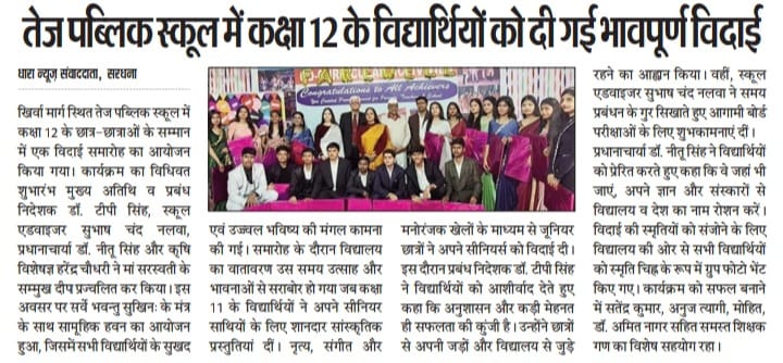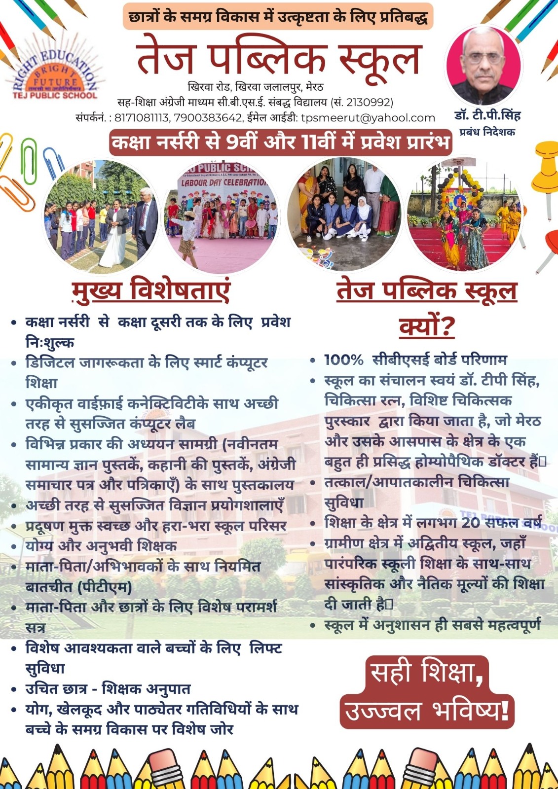 Tej Public School is the most prestigious school in the area. It is situated at Khirwa road, surrounded by agricultural fields in pollution free environment. It is known for its student's discipline,qualified and experienced teachers and its attractive atmosphere. Dr. T.P. Singh, manager of the school, is performing his duties very sincerely and providing all possible facilities for the betterment of school, staff and students.